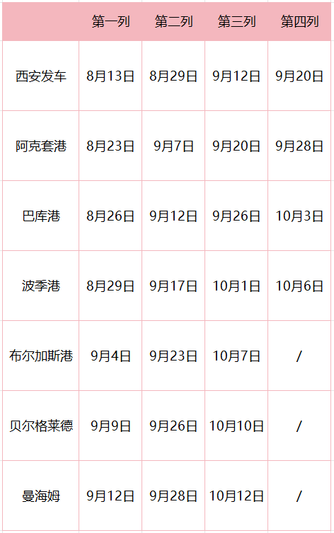 班列从西安国际港站发车,途经哈萨克斯坦、阿塞拜疆、格鲁吉亚、保加利亚,塞尔维亚、匈牙利、奥地利,最终抵达德国曼海姆,全程1.13万公里,平均运行时效29天,近期站到站时效将稳定在25天。近期班列时效如下: